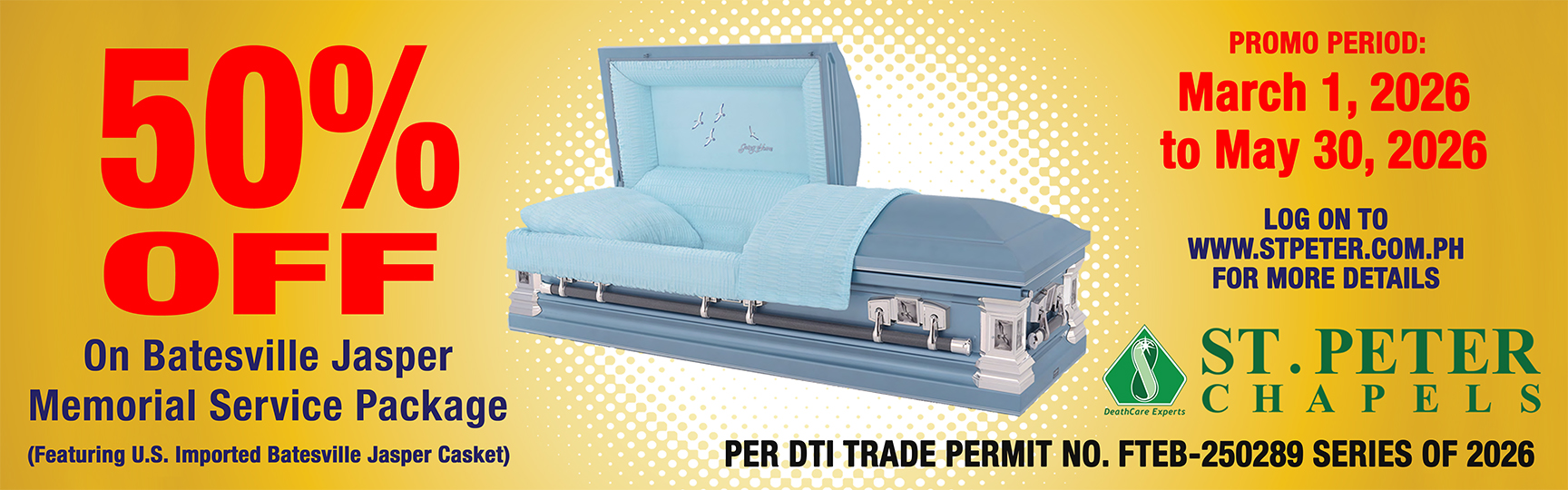 11. The 50% discount on Batesville Jasper Casket Memorial Services may be availed in selected St. Peter Chapels nationwide (please see list of participating St. Peter Chapels Nationwide).
