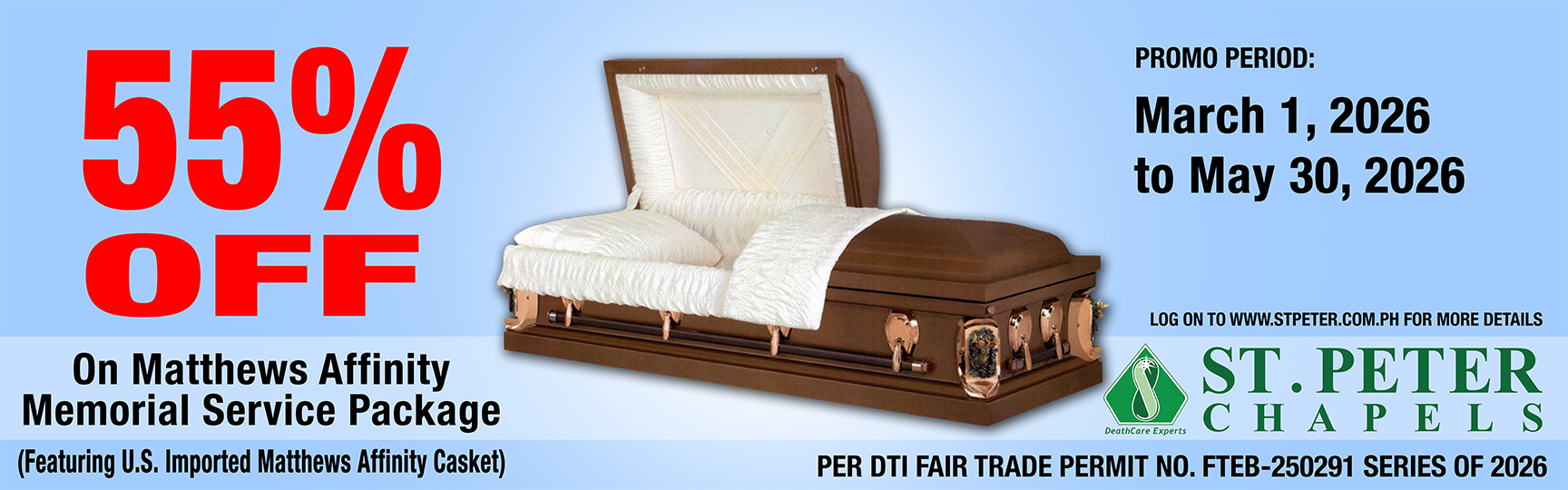 11. The 55% discount on Matthews Affinity Casket Memorial Services may be availed in selected St. Peter Chapels nationwide (please see list of participating St. Peter Chapels Nationwide).